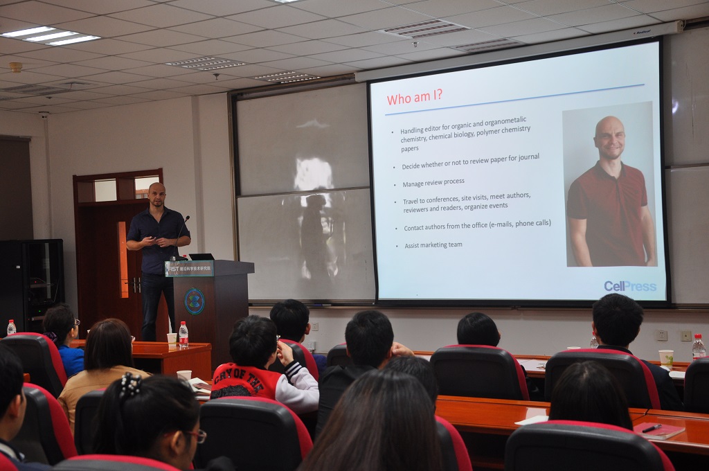 2018年10月16日,Chem期刊副主编韦杰科斯拉夫•迪卡雷斯博士来我院进行参观交流,并在曲江校区西二楼A102作题为“Publishing in Chem and Cell Press”的主题报告。科研副院长李鹏飞教授主持此次报告,众多师生到场聆听。