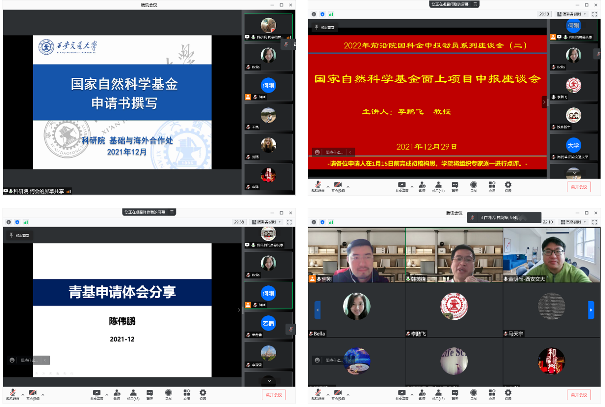 为进一步提升国家自然基金标书撰写的质量和水平,争取实现学院国家自然科学基金项目的再次突破,12月28日至30日bwin通过线上方式组织开展2022年国科金申报系列会议,为不同类型基金项目的申报进行针对性指导。科研院副院长刘永忠、主管何会受邀出席动员会,西北大学韩英锋教授、西安交大化学学院周桂江教授受邀出席座谈会,bwin院长邵金友、bwin党委书记刘莹以及全体教师和部分研究生参加会议。会议由副院长何刚主持。