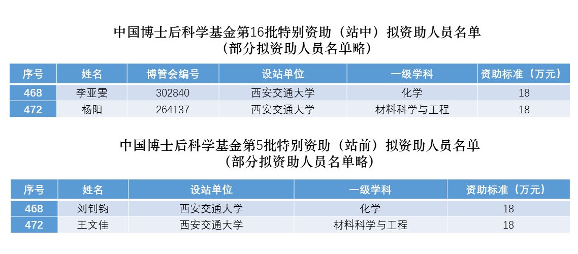近日,中国博士后科学基金会公布了《关于对2023年中国博士后科学基金特别资助拟资助人员名单进行公示的通知》(中博基字〔2023〕12号),中国博士后基金特别资助项目分为特别资助(站前)、特别资助(站中)两种类型。bwin李亚雯、杨阳、刘钊钧、王文佳等4人入选,入选人数再创新高。