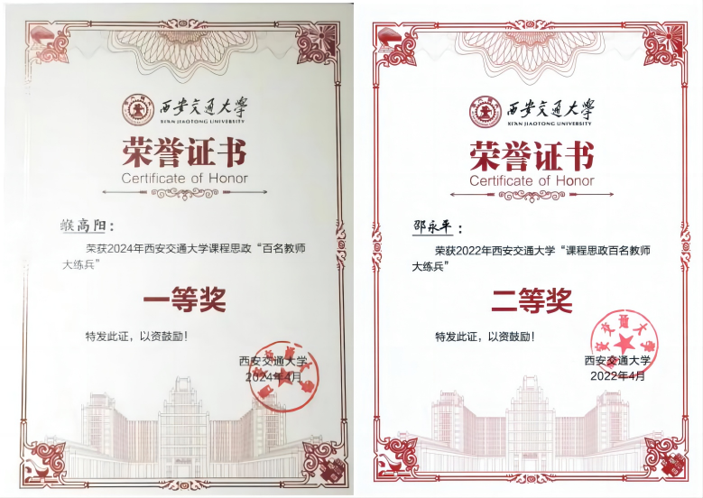 近日,西安交通大学2024年课程思政“百名教师大练兵”获奖名单公布,经学院推荐、初赛遴选及决赛评审,本次活动共有56位教师获奖,我院缑高阳副教授获一等奖。在历次西安交通大学课程思政“百名教师大练兵”活动中,郑彦臻教授获特等奖、邵永平教授获二等奖、吴超教授获优秀奖。此外,郑彦臻教授的研究生课程《表征科学》获评“西安交通大学研究生精品课程”,缑高阳副教授的研究生课程《钙钛矿材料中的凝聚态物理效应》获评“西安交通大学研究生课程思政示范课程”。