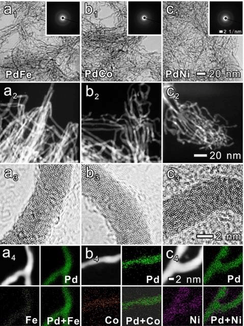 图2. 利用非晶态非贵金属纳米核诱导产生非晶态钯基纳米线。
