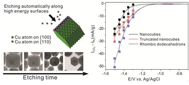 该研究成果已发表在化学领域期刊《ACS纳米》 (ACS Nano.,影响因子12.881),题为“Selectivity on Etching: Creation of High-Energy Facets on Copper Nanocrystals for CO2 Electrochemical Reduction”。论文链接为http://pubs.acs.org/doi/abs/10.1021/acsnano.6b00602