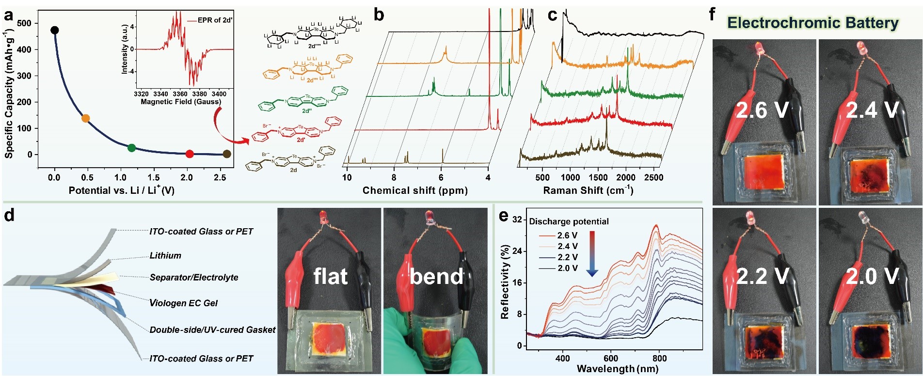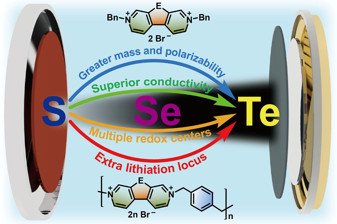 基于上述考虑,西安交通大学的何刚教授在前期含硫族元素紫罗精的研究基础上,成功制备了含硫族元素紫罗精聚合物,并将其作为电极材料应用到有机自由基锂离子电池中。研究发现,随着硫/硒/碲的引入,电池容量及循环稳定性都有大幅提升。其中含碲紫罗精聚合物表现出了最优的性能,当库伦效率达到100%时容量达到了502 mAh g-1。相关机理研究表明随着碲原子的引入极大提高了电极材料的电导率以及增加了锂化位点。在此基础之上,将含碲元素紫罗精聚合物的电致变色性质与电池应用相结合,制备了一种新型的柔性变色电池,在电池的充放电过程中,伴随着明显的颜色变化。这一研究工作不仅发展了一类新型的有机自由基电池,还为变色电池领域的研究提供了新的思路。