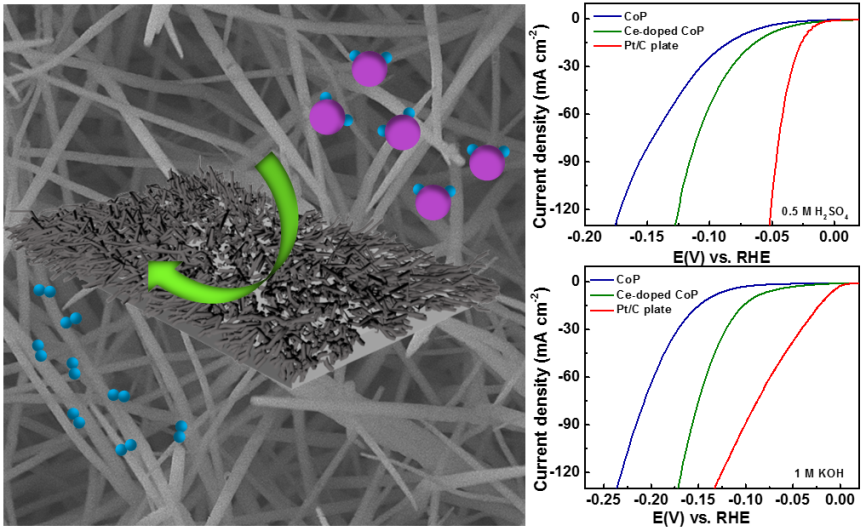 近日,西安交通大学bwin瞿永泉教授课题组、化工学院常春然副教授课题组与香港城市大学何颂贤副教授课题组合作,通过简单的化学方法在磷化钴中掺杂铈元素,降低其表面氢吸附能、改善表面电荷特性,大幅提高了催化剂的产氢活性。理论计算表明在磷化钴表面掺杂铈元素可以改善活性中心的电子结构,降低磷化钴表面的氢吸附能,减小氢气产生的反应势垒,从而加快催化剂的析氢速率。实验结果也进一步证实,掺杂铈元素的磷化钴相比于未掺杂的磷化钴,具有更多的催化活性位点、更高的转换频率和良好的电荷传输特性,这使得其在酸性和碱性介质中的电催化活性均得到大幅提高,并且能保持良好的稳定性。这种通过引入稀土元素改善电催化剂产氢活性的方法,对于认识稀土元素对其它过渡金属催化剂的影响,进而提高电催化剂活性有重要借鉴意义。