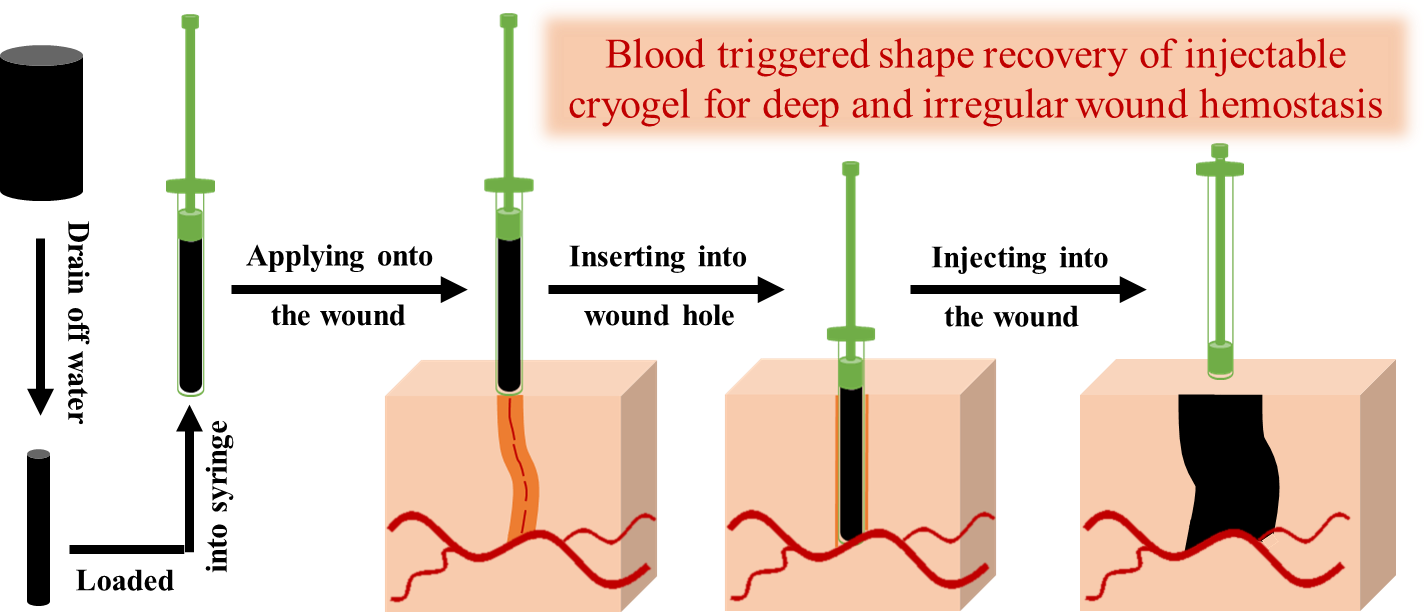 近日,在郭保林研究员的指导下,西安交通大学bwin博士生赵鑫使用壳聚糖衍生物和碳纳米管材料制备成具有可注射的形状记忆纳米复合多孔晶胶止血材料。壳聚糖衍生物作为晶胶的主要骨架,可以提供很好的止血性能、促进伤口愈合以及血液触发形状记忆恢复功能。碳纳米管材料作为纳米填料,可以提高晶胶的力学性能、赋予晶胶良好的导电性以及出色的近红外触发响应性(例如止痛药物缓释、光热杀菌等),同时碳纳米材料也可进一步提高复合晶胶的促凝血性能。该复合晶胶的血细胞和血小板吸附与激活能力使其在小鼠尾部截肢模型和肝脏损伤模型中表现出出色的止血性能。此外,由于该复合晶胶的快速血液吸收性、血液浓缩性能以及快速的血液触发形状恢复作为具有足够机械性能的物理填充屏障,使其在兔子肝脏体积缺损、不可压缩性出血致死模型中表现出优异的止血效果。该形状记忆复合晶胶止血敷料的原料来源广、便宜,其制备简便,具有巨大的应用潜力。
