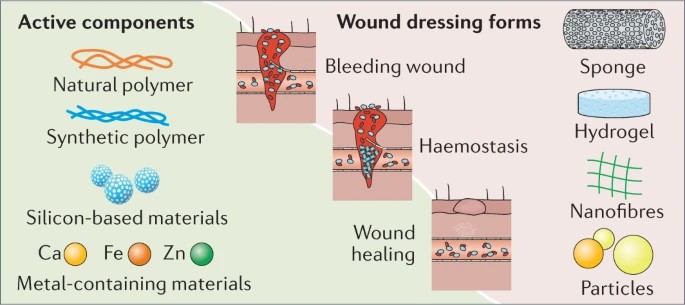 基于在用于伤口愈合应用的止血材料方面的突出贡献,近日,郭保林教授团队受邀在国际顶级期刊《Nature Reviews Chemistry》发表用于伤口愈合应用的止血材料相关综述。该综述通过对近年来国际国内止血材料的开发进行研究归纳,从止血和伤口愈合的生理机制、目前止血材料的不同活性成分(包括天然聚合物、合成聚合物、硅基材料和含金属材料)以及止血材料的不同形式状态(包括海绵、水凝胶、纳米纤维和颗粒等)等方面,对现有伤口敷料的止血材料进行了总结与评价,重点介绍了现有止血材料化学设计和制备过程。同时,该综述还对现有止血材料中不同活性成分和止血材料形式的优点和局限性进行了归纳,提出了伤口愈合止血材料发展中所面临的挑战和其未来方向。