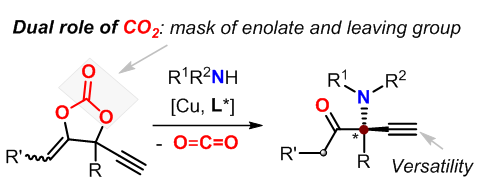 针对上述挑战,郭武生教授课题组设计了一种新型的环状碳酸酯。在铜的催化作用下,该碳酸酯经历脱羧反应生成与铜键合的两性烯醇离子中间体。该中间体含有α和β两个具有平面特征的sp2杂化碳,从而较大程度地减少了形成四取代立体中心的空间位阻效应。此外,烯醇氧负离子一是会与胺亲核试剂形成牢固的氢键作用,二是可作为潜在的π-π作用受体,这些因素都有利于胺试剂亲核进攻的不对称选择性的控制(图1)。