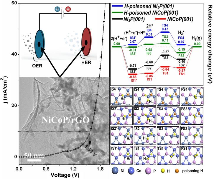 该论文除了创新性地设计、并制备出该类三元复合材料外,还通过实验与理论模拟的手段,系统研究了三元镍钴磷体系的电解水产氢的微观机理。研究表明,在真实反应条件下,当高效反应活性位点被氢毒化时,三元体系中钴掺杂的引入能够带来适当的氢吸附,以及更加温和的氢气脱附,从而使三元体系表现出更优异的电催化产氢性能。该研究结果不仅报道一种高效的电解水产氢催化剂,同时还对新型产氢催化剂的设计起到指导作用。