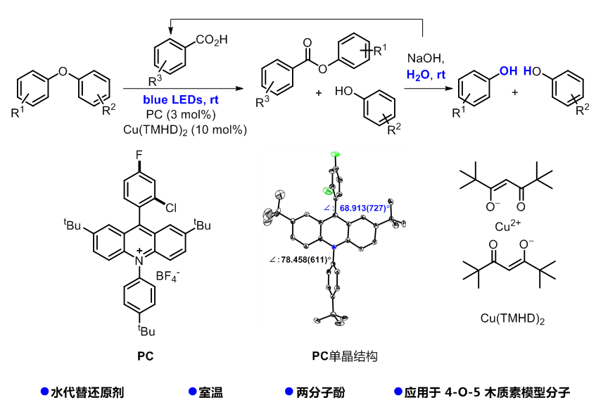 该成果以论文形式发表在《自然通讯》(Nature Communications, 2020, 11, 6126),论文题目为“Visible-light photoredox-catalyzed C–O bond cleavage of diaryl ethers by acridinium photocatalysts at room temperature”。