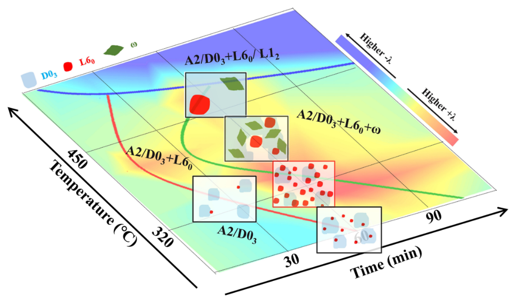 在前期“铁磁合金中析出共格第二相可实现高灵敏磁致伸缩效应”工作的基础上,该团队系统研究了大磁致伸缩Fe-Ga合金早期脱溶阶段的时效时间-温度-相变(Time-Temperature-Transformation,TTT)关系,明确了四方结构析出相由共格转变为非共格以及有害的次生相析出的临界热处理条件,并建立了基于磁致伸缩性能的非平衡TTP(Time-Temperature-Property)相图(图2)。在非平衡TTT相图指导下,采用优化的热处理工艺将材料的磁致伸缩性能提高到单相状态的3倍。该工作以《增强Fe-Ga合金磁致伸缩效应的时间-温度-转变非平衡相图》(Non-equilibrium time-temperature-transformation diagram for enhancing magnetostriction of Fe-Ga alloys)为题在《材料学报》(Acta Materialia )在线发表,bwin博士生张艺群和青年教师苟峻铭博士为论文第一作者。此外,该团队与中国工程物理研究院张昌盛研究员合作,采用原位磁化小角中子散射(SANS)技术研究了共格析出相在磁化过程中的响应,发现两相交换耦合长度大于析出相尺寸,两相间自旋过渡区先于基体磁畴而发生翻转,从而阐明了纳米异质结构产生高灵敏磁场响应的物理机制。相关论文《大磁致伸缩Fe-Ga合金纳米异质相的响应:原位磁化小角中子散射研究》(Nanoheterogeneity response in large-magnetostriction Fe-Ga alloys: an in-situ magnetic small-angle neutron scattering study)发表于《材料学报》(Acta Materialia)。