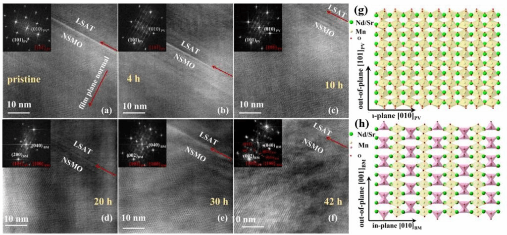 图3 NSMO薄膜的原位等温(500℃)HR-TEM表征结果:由氧空位浓度增加诱发的拓扑相变过程