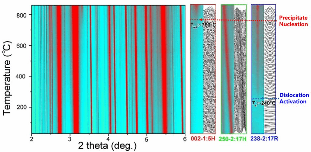 图1 2:17型Sm-Co磁体的原位升温高能XRD图谱: 1:5H析出相形核温度Tnd高于位错开动温度Ta