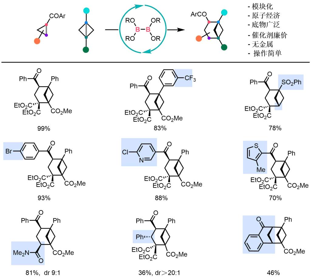 环状结构在小分子药物中普遍存在,但由于传统合成药物多含有二维扁平芳环,空间结构变化有限,限制了药物开发的成功率。鉴于药物研发中“逃离二维”这一新兴需求,亟需发展高效构建三维饱和环状结构的方法。最近,双环[3.1.1]庚烷(BCH)被证明可作为苯环的有效三维生物电子等排体。然而已知的BCH合成方法非常少,需要经过较多步骤,且难以用于多取代BCH的合成。