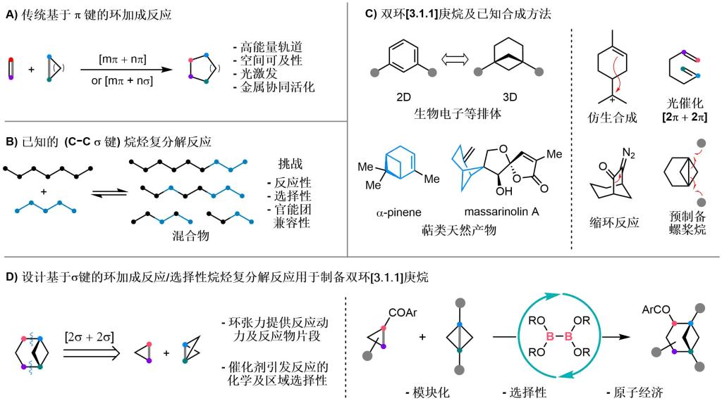 由于环加成反应具有100%原子经济性、高度模块化和快速构建复杂分子等特点,通常是合成环状分子的优先选择。纵观超过百年的发展过程,传统环加成的反应物至少含有一个π键,这是由于碳-碳π键能提供较高能量且空间可及的轨道,或者易于通过光激发或金属配位活化。相比之下,碳-碳σ键一般较为惰性,仅以碳-碳σ键参与的环加成反应非常稀少。同时,以碳-碳σ键重组为特征的烷烃复分解反应也缺乏控制化学选择性和区域选择性的策略,通常会导致混合烷烃产物的产生。因此,高效、高选择性的碳-碳σ键的重组(复分解)依然是合成领域的一大挑战。
