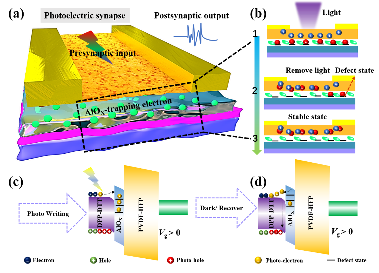 图1 柔性智能突触晶体管的结构和光突触可塑性增强的机理图