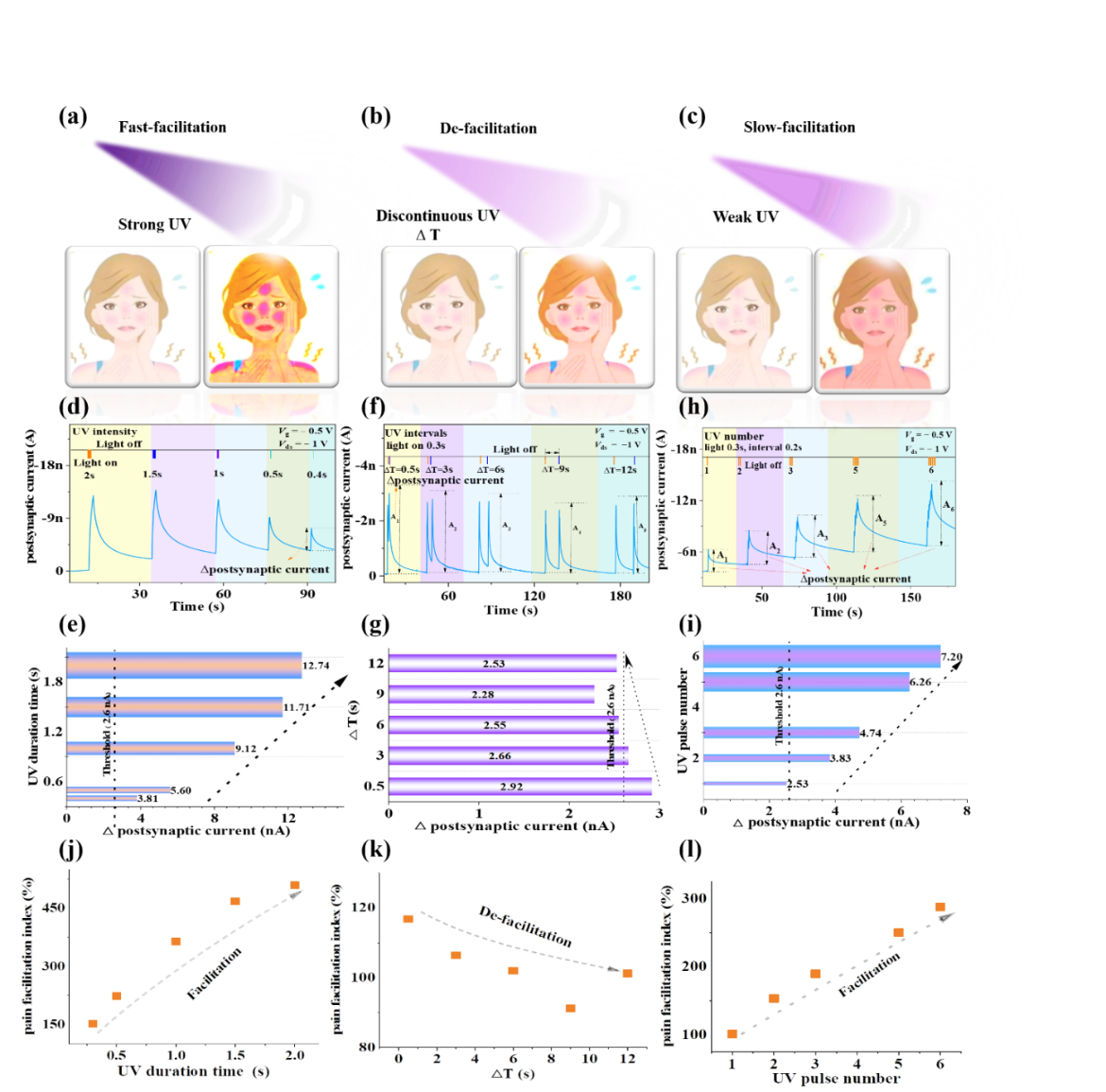 西安交通大学bwin鲁广昊教授团队报道了一种具备多波长响应和多功能突触可塑性的柔性有机场效应智能突触晶体管。该研究通过在绝缘层和有机半导体层中间引入氧化铝(AlOX)纳米粒子进一步提高了光生激子的分离效率,从而增强了晶体管的光学突触可塑性(图1)。此外,通过优化AlOX的厚度,可以同时实现光电突触可塑性功能。在此基础上,该研究不仅展示了基本的电突触可塑性,包括兴奋性突触后电流(EPSC)、抑制性突触后电流(IPSC)、脉冲数量和时间依赖可塑性、多波长光响应突触可塑性(红光625 nm、绿光525 nm、紫外光365 nm)等功能,而且成功模拟了紫外光诱导的皮肤晒伤功能(图2),进一步提出了光电脉冲协同调节的学习效率模型。通过神经网络训练进一步实现了手写数字的高准确率识别,“鹿”图像学习和记忆功能也被成功模拟。这项工作为提高突触器件的光学响应和促进多功能神经形态计算系统的发展提供了有效策略。