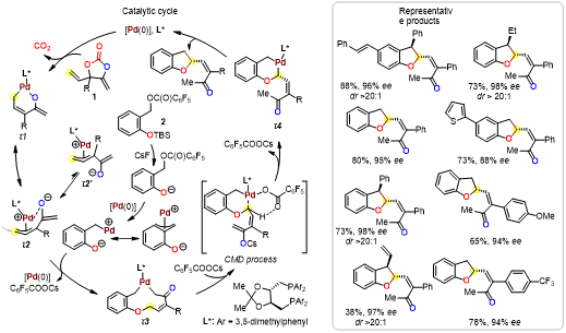 近日,西安交通大学郭武生教授团队报道了一种基于瞬态σ-烷基钯不对称Csp3-H活化的催化模式,实现了系列手性二氢苯并呋喃化合物的高效合成。该反应利用团队自主开发的源于CO2的乙烯基亚甲基环状碳酸酯1为原料,通过与邻亚甲基苯醌前体2反应,在钯催化条件下,分别历经烯丙基取代反应和基于不对称sp3碳氢活化的(4+1)串联环化过程反应对醚、乙烯基、氰基、三氟甲基、甲氧基、萘、氟、溴、噻吩等官能团具有良好的兼容性,且能以优异的收率及选择性获得目标产物。机理研究表明,乙烯基亚甲基环状碳酸酯脱羧原位产生的烯醇负离子对σ-烷基钯中间体具有重要的稳定作用。原位生成的羧酸根离子对反应经历的协同金属化去质子化过程至关重要。