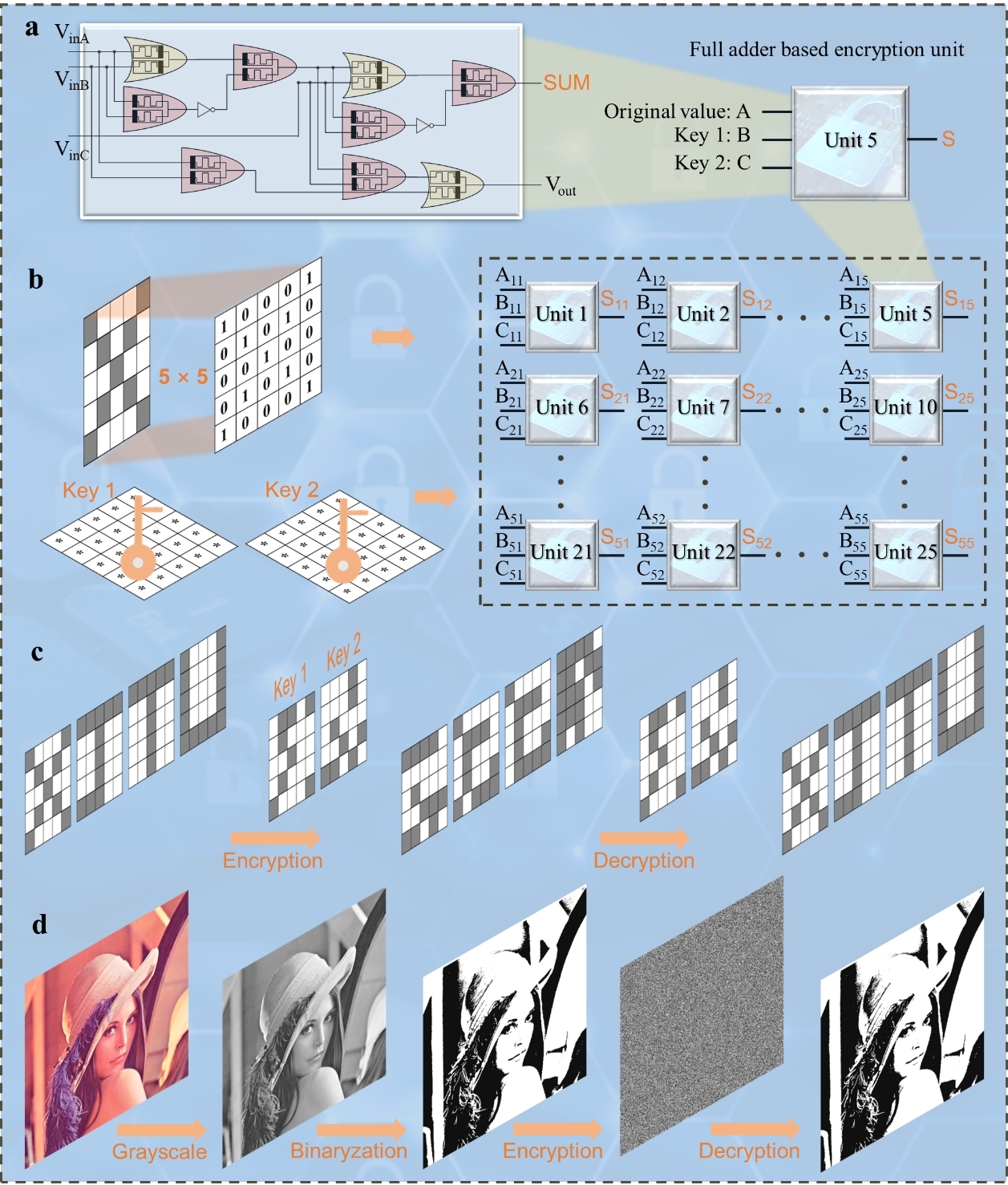 在当前这个信息大爆炸的时代,大量数据不断产生、传输和接收。如何保证数据在传输过程中的机密性和完整性成为国家、机构和个人关心的首要问题,尤其是在处理国家机密、先进设备和核心技术等敏感信息方面展现出巨大的应用前景。然而,大多数数据加密都是基于软件程序实现的,从而增加了潜在被解密的可能性。因此,探索基于硬件的加密方法无疑是增强数据安全性的一条大有可为的途径。忆阻器具有强大的逻辑计算能力、更高的集成密度和极低的功耗,被认为是最有前途的下一代电子器件,有望实现类脑神经形态计算。然而,基于忆阻器的新兴电路器件的设计及其在非常规领域的潜在应用对于实现传统电子器件无法完成的一些任务具有重要意义。特别是考虑到忆阻器与传统CMOS电路兼容,因此被视为构建逻辑电路和设计物理加密器的最有前景的候选器件之一
