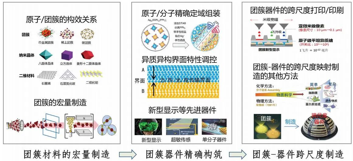 原子/分子团簇是物质结构的一种新形态,具有独特的本征性质。从原子/分子团簇到器件的跨尺度制造,将为国防高端装备和新兴电子等产业发展带来深刻变革。团簇的多物质构效关系、宏量制造、团簇结构跨尺度构筑以及团簇器件的高性能制造等是原子/分子团簇器件制造的关键发展方向,主导着从原子到产品制造的发展历程。把握这些发展背后的重要机遇,将有助于占领原子级制造研究的制高点,引领原子级制造方法的变革。由原子/分子团簇直接构筑功能器件或构件,是产品制造的新形式,在先进制造领域具有重要的意义,其中包括两个方面。首先,可以微缩器件的特征尺寸并提高制造精度。在集成电路的发展中,越小的器件尺寸意味着更高的集成度和更好的性能。利用原子/分子团簇直接构筑功能器件或构件可以将器件尺寸缩小到原子水平,将成为在后摩尔时代提高芯片性能的重要途径。其次,该策略更具颠覆性的意义,因为它可以突破分子和晶体的限制,通过对原子的精细操控来创造新分子、新材料和新器件。因此,原子/分子团簇直接构筑功能器件或构件不仅是由原子尺度物质科学支撑的先进制造技术,而且是推动物质科学发展的一种未来技术,甚至是未来物质科学的一种新形态,其必将颠覆现有制造方式获得的产品性能,深远影响高端国防装备和新兴电子产业的未来发展。另一方面,通过对原子结构的调控,能够提高材料的工作温度,实现陶瓷增韧,为高超航天器提供新型耐高温材料与结构。在电子产业领域,将原子/分子团簇等按照一定的方式进行组装能构筑具有特定功能的器件,如具有超高分辨率、超高亮度、超快响应能力的新型显示器、红外光电探测系数数倍增强的超敏传感器、以及单分子电子器件及其构建的下一代集成电路等。