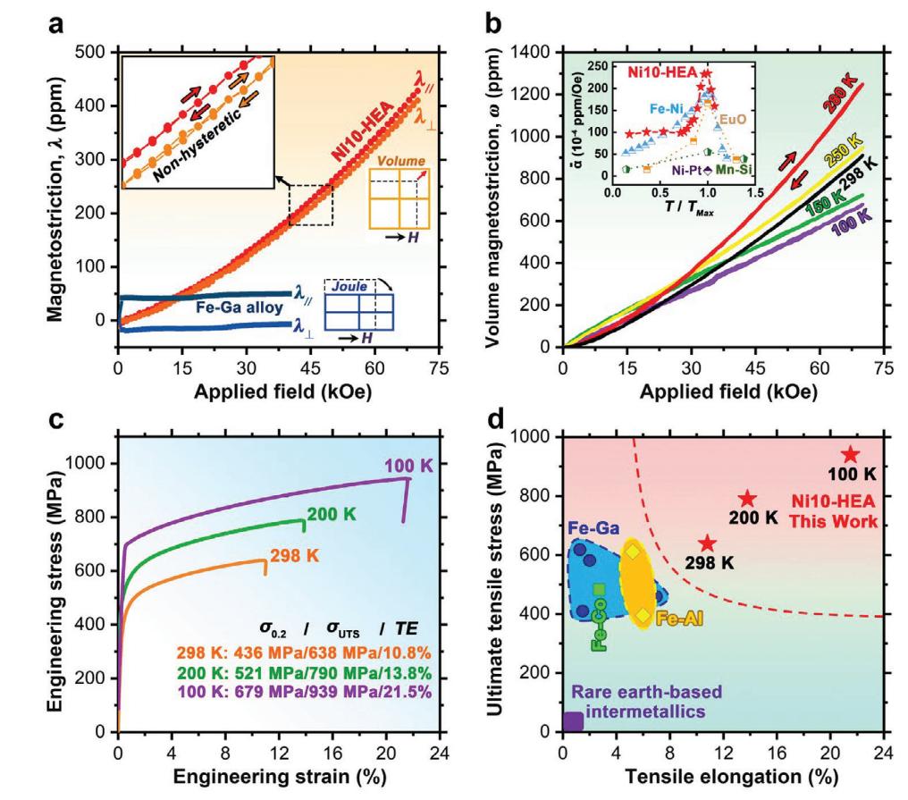 最近,bwin马天宇教授团队基于多主元交互效应思想,设计出一种新型磁性材料——宽温域无滞后大体磁致伸缩强韧高熵合金(Fe-Co-Al-Cr-Ni,简称Ni10-HEA)。如图1所示,该合金在298 K到100 K的宽温域表现出无滞后的大体积磁致伸缩效应,其体积磁致伸缩系数和服役温域均优于已有的体磁致伸缩材料。此外,该合金还同时具备宽温域高强度和高韧性,屈服强度、拉伸强度和拉伸断裂应变均优于商用磁致伸缩材料,而且在降温过程中也不发生韧-脆转变。因此,该工作为深空与深海探测技术急需的特种功能材料提供了重要候选,也为设计高性能结构-功能一体化材料提供了新思路。相关工作以《强韧高熵合金的无滞后大体磁致伸缩效应》“Large Non-hysteretic Volume Magnetostriction in a Strong and Ductile High-Entropy Alloy”为题在线发表于材料领域国际顶级期刊《先进材料》(Advanced Materials)。同时,该工作已申报国家发明专利。bwin助理教授苟峻铭和博士生潘贇为论文第一作者,马天宇教授为论文通讯作者,合作者包括中国工程物理研究院张昌盛博士、四川大学刘畅博士和中国科学院宁波材料研究所夏卫星研究员。