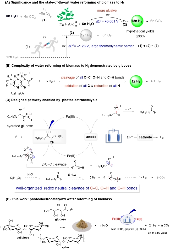 本文利用廉价易得的FeCl3•6H2O作催化剂,以石墨电极为阳极,镍电极为阴极,在420−430 nm蓝光照射下,通过有序断裂C−C键、O−H键及C−H键,实现了葡萄糖、纤维二糖、木聚糖、原生生物质水解液及衍生物水合重整制氢,产率最高可达93%(图1)。