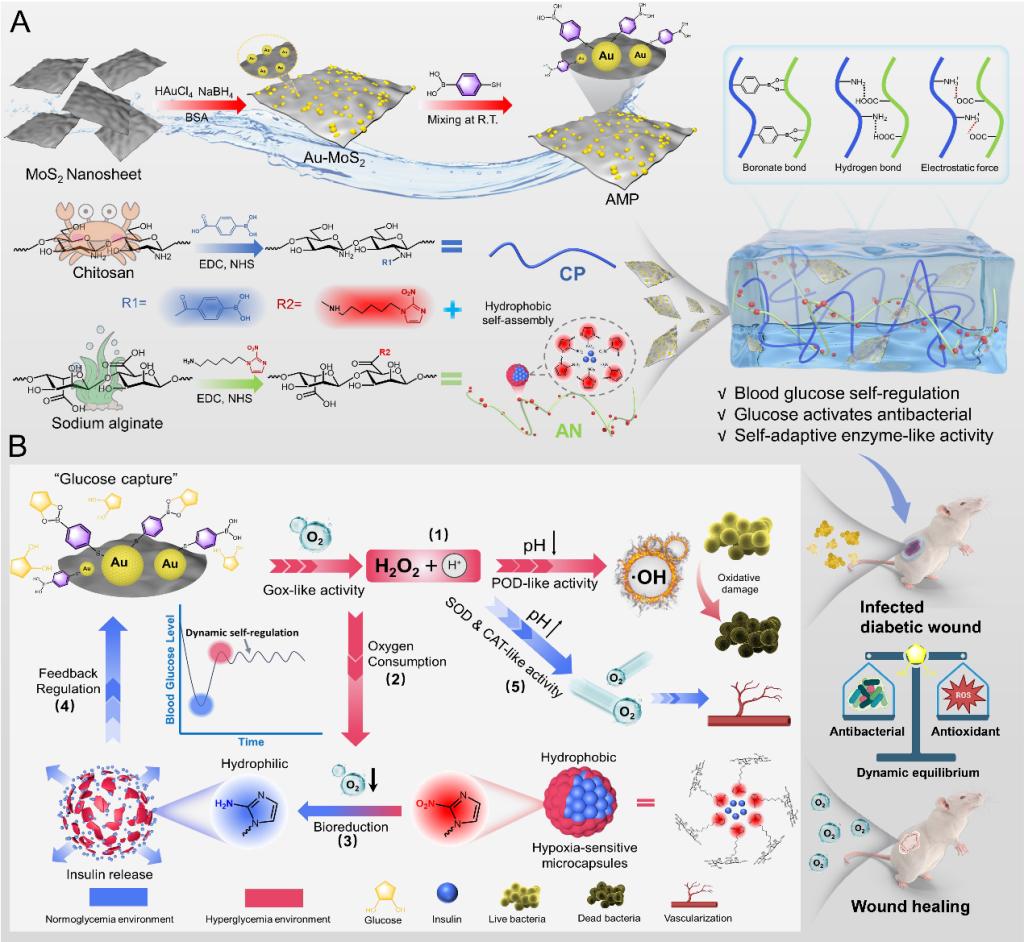 近期,郭保林教授团队设计了一种通过动态硼酸酯键、静电作用力和氢键交联的程序化自适应治疗水凝胶,水凝胶由苯硼酸改性壳聚糖(CP)、疏水性缺氧敏感2-硝基咪唑改性海藻酸钠(AN)和苯硼酸功能化Au-MoS2复合纳米酶(AMP)组成。AMP纳米酶能够适应创面微环境酸碱度自切换多种类酶活性。缺氧敏感2-硝基咪唑诱导两亲性AN在水相中自发卷曲形成微胶囊用于包裹胰岛素,并在缺氧条件下实现胰岛素按需输送。在高血糖环境中,水凝胶通过催化葡萄糖氧化产生ROS菌。在葡萄糖氧化后加剧的缺氧环境中,两亲性AN硝基咪唑基团通过体内生物还原反应转化为亲水性氨基咪唑,破坏微胶囊的两亲性平衡实现按需释放胰岛素。在正常血糖环境中,水凝胶通过释放氧气抑制缺氧敏感微胶囊的结构转变,缓解组织缺氧。综上所述,这项研究通过开发一种新型葡萄糖激活自切换类酶活性水凝胶,根据血糖浓度变化适应性激活具有不同生物学功能的类酶活性动态反馈方式释放胰岛素调节机体血糖水平,实现了对糖尿病慢性伤口的适应性治疗确保伤口愈合有序进行,这项工作为糖尿病伤口适应性治疗提供了新思路和方法。