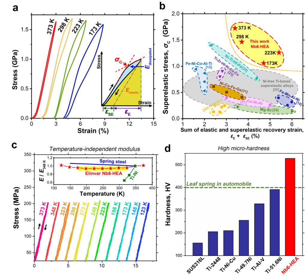 最近,bwin马天宇教授团队提出功能与结构基元协同构筑新思路,基于多种金属元素之间的交互效应,通过原位生成纳米尺度功能基元(低弹模可相变基元)和微纳多尺度结构基元(高弹模不相变强化基元),设计出一种宽温域兼具高σC和Elinvar效应的(TiZrHf)44Ni25Cu15Co10Nb6(称为Nb6-HEA)新型超弹合金。该合金在-150至+100℃的宽温域内的保持1.2GPa以上的高超弹应力σC(优于商业超弹合金的1GPa)和2.5%以上的超弹应变,同时在600MPa高应力下保持几乎与温度无关的弹性模量,也优于商业钛镍超弹合金。研究表明,该合金的高σC超弹性源于功能基元与结构基元的相互作用,即低弹模功能基元在应力作用下的连续相变提供了大可恢复应变,高弹模结构基元阻碍了位错滑移,确保了高σC。功能基元在降温过程中的应变玻璃转变造成连续晶格软化效应,从而补偿了无相变结构基元的本征模量硬化作用,从而产生Elinvar效应。此外,该合金还具有高硬度和良好的耐腐蚀性能。因此,上述优异的组合性能使该合金可望用于航空航天大温差环境及先进工业领域,例如汽车的减振板簧和精密计时器等。