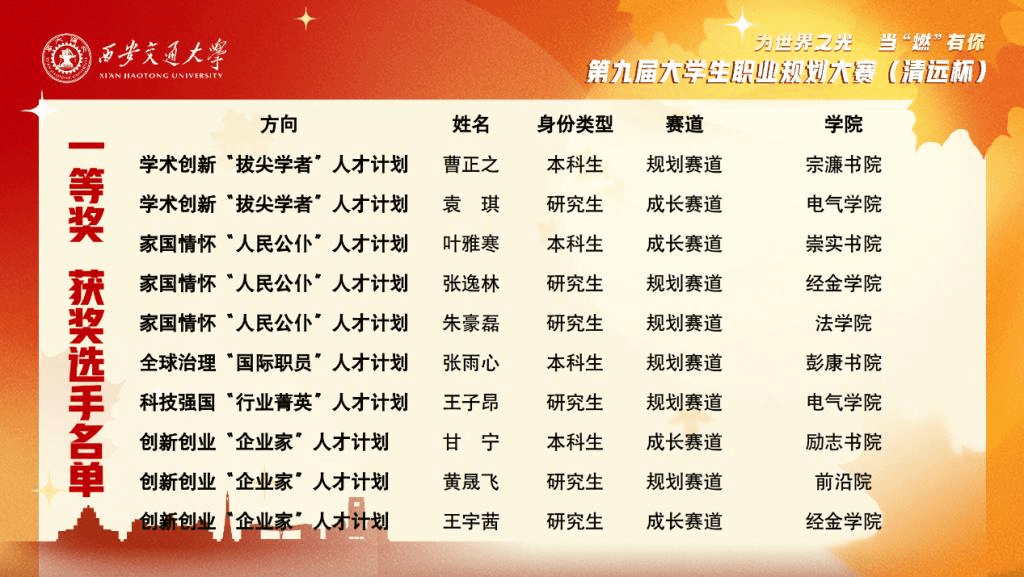 西安交通大学第九届大学生职业规划大赛(清远杯),是由陕西省教育厅指导,学生就业创业指导服务中心主办,广东清远高新技术产业开发区管理委员会支持。本届大赛主题是“为世界之光 当‘燃’有你”,参赛对象为交大全日制在校本科生、研究生。报名学生按照所在年级划分赛道,各赛道内根据“学生就业引领计划”分为拔尖学者、人民公仆、国际职员、行业菁英、企业家五组。比赛分院级初赛、校级初赛、复赛和决赛。