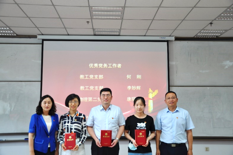 刘莹指出,希望受到表彰的党员和党支部珍惜荣誉、再接再厉,全面对照党章、党规、党纪,按照“七个有力”进一步担负好教育、监督、管理党员和组织宣传、凝聚服务广大师生的职责,传承西迁精神,爱国奋斗,坚持“四个服务”、落实“四个全面”,充分发挥党员先锋模范作用和党支部战斗堡垒作用。